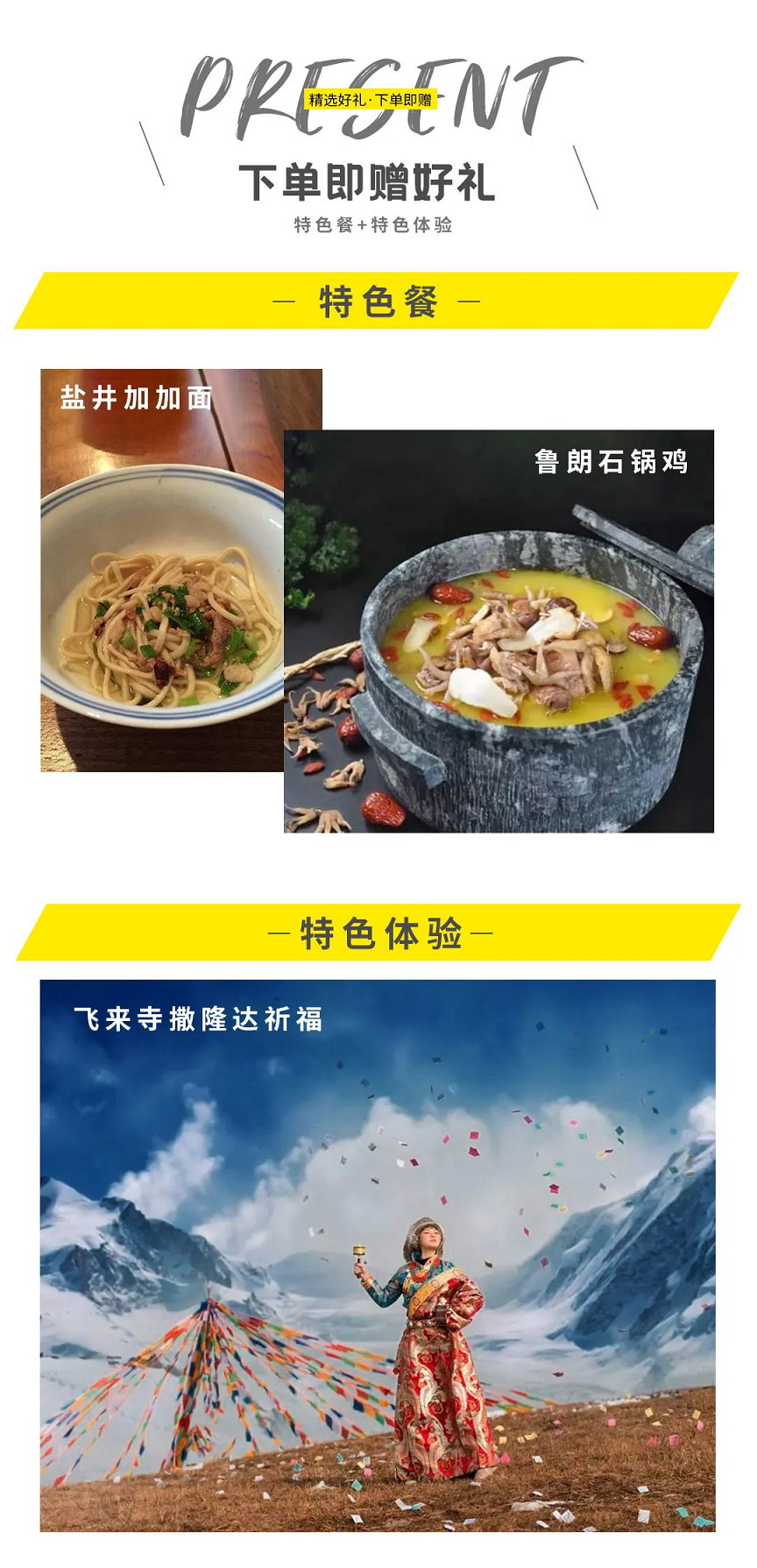 5、赠送:赠送盐井加加面、鲁朗石锅鸡、飞来寺撒龙达祈福、2人同时报名赠送接机服务一次、一次性雨衣一件;赠送藏服拍照;拉萨住宿一晚;赠送项目不用不退