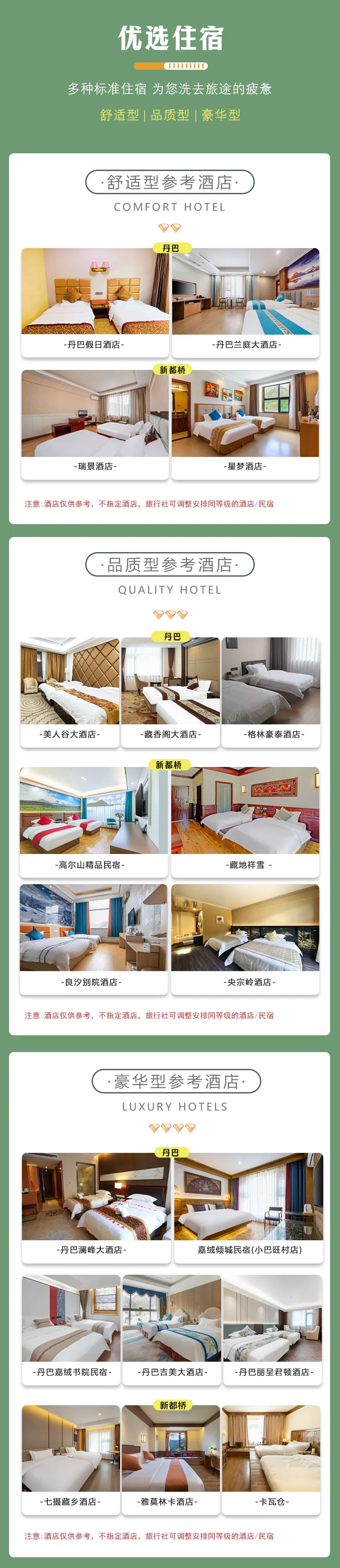 3、住宿:3晚酒店标间,不指定酒店--舒适型住宿不含早餐,轻奢型住宿含早餐,(默认住宿为标间双床房,若单人出行则尽量协调拼房,若拼房不成功则补房差费用);