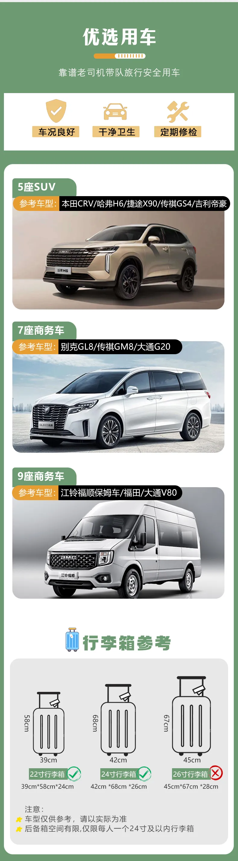 1、用车:根据人数安排用车,5座SUV/7座商务车/9座商务车;
