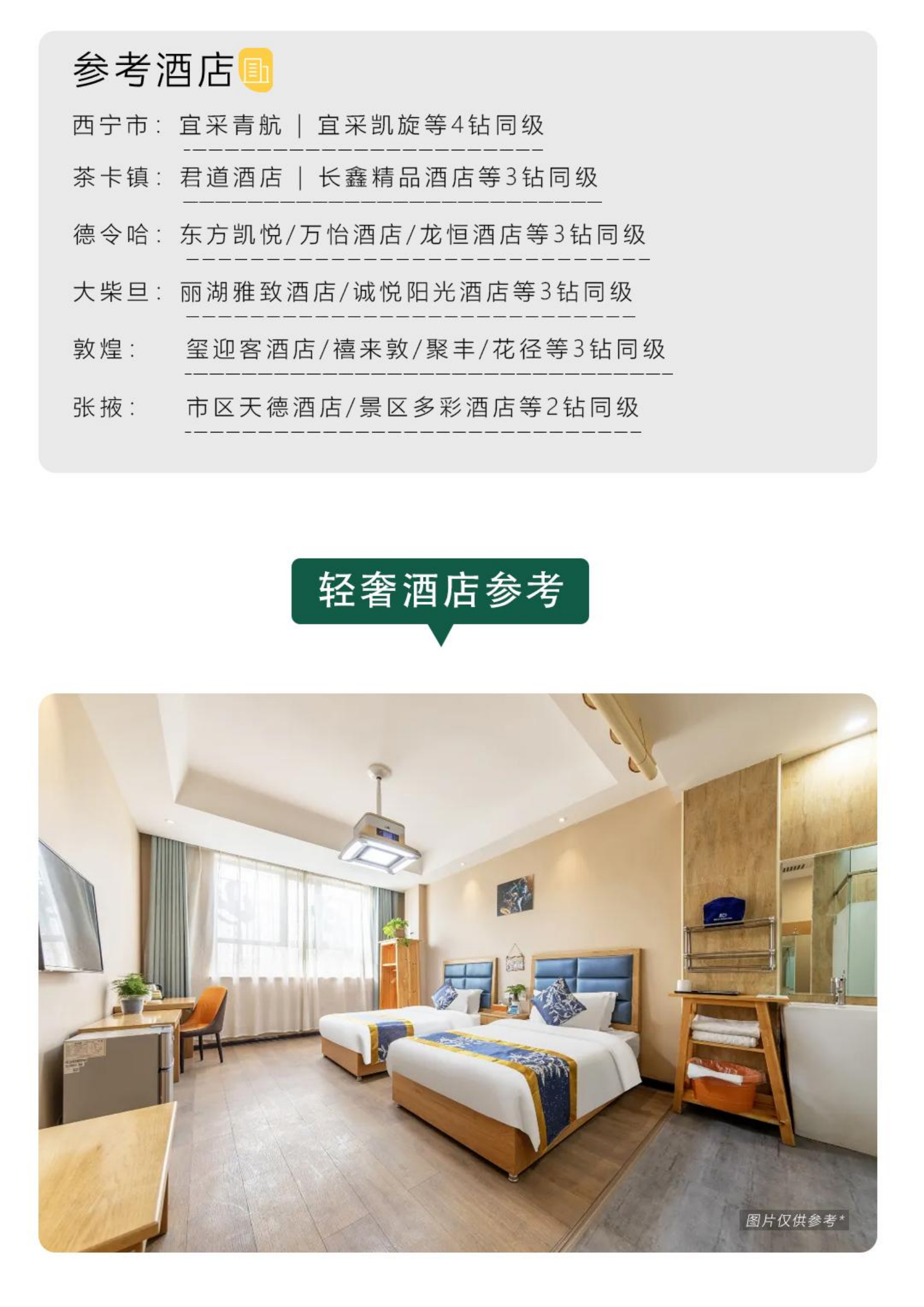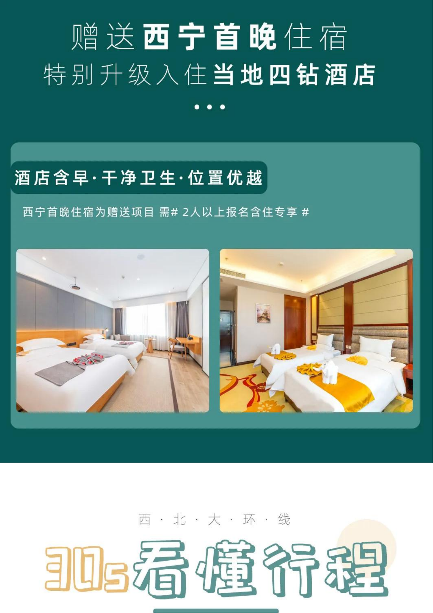 2、住宿:行程所列5晚精品酒店标间+1晚西宁赠送酒店标间·携程四钻(当地准五)+1晚敦煌沙漠露营;每人1床位,报价以1人1床位计算,若产生单男单女无法拼房客人自补房差,全程入住酒店双人间,西北沿线住宿硬件和软件条件都有限,请不要以城市的标准来衡量,敬请谅解;