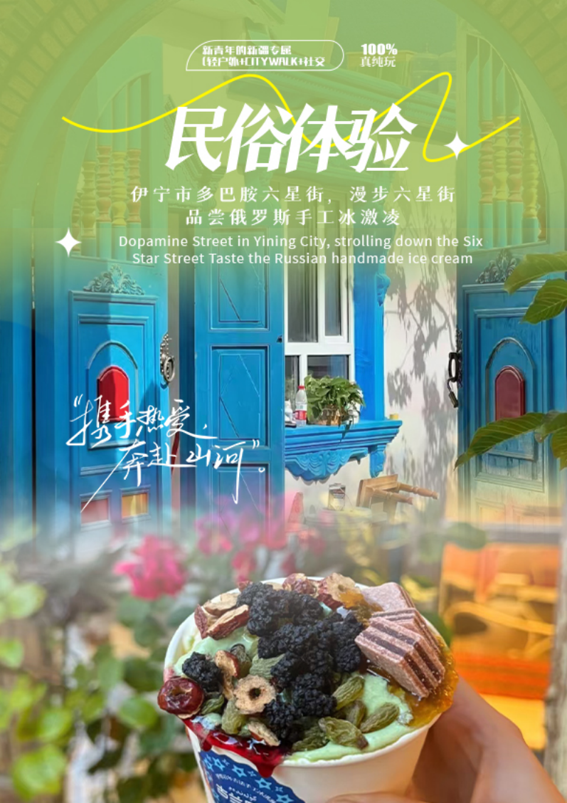 16:00-19:30抵达伊宁后自由漫步在多巴胺小镇【六星街】(留够时间,至少游玩1小时),有六条主干道从中心向外辐射,把街区分成六个扇形地区,中心为学校、商铺、清真寺等公共建筑,外围为居住区,形成一个独具特色的居住模式。现居住着汉、哈萨克、回、维吾尔、俄罗斯、塔塔尔等民族的居民,特别安排品尝俄罗斯冰淇淋。
