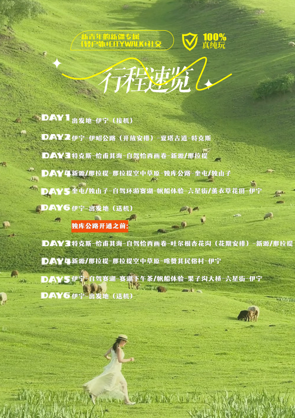 1.优先安排前往那拉提空中草原,如大雪封山则改为游玩河谷草原,费用不变