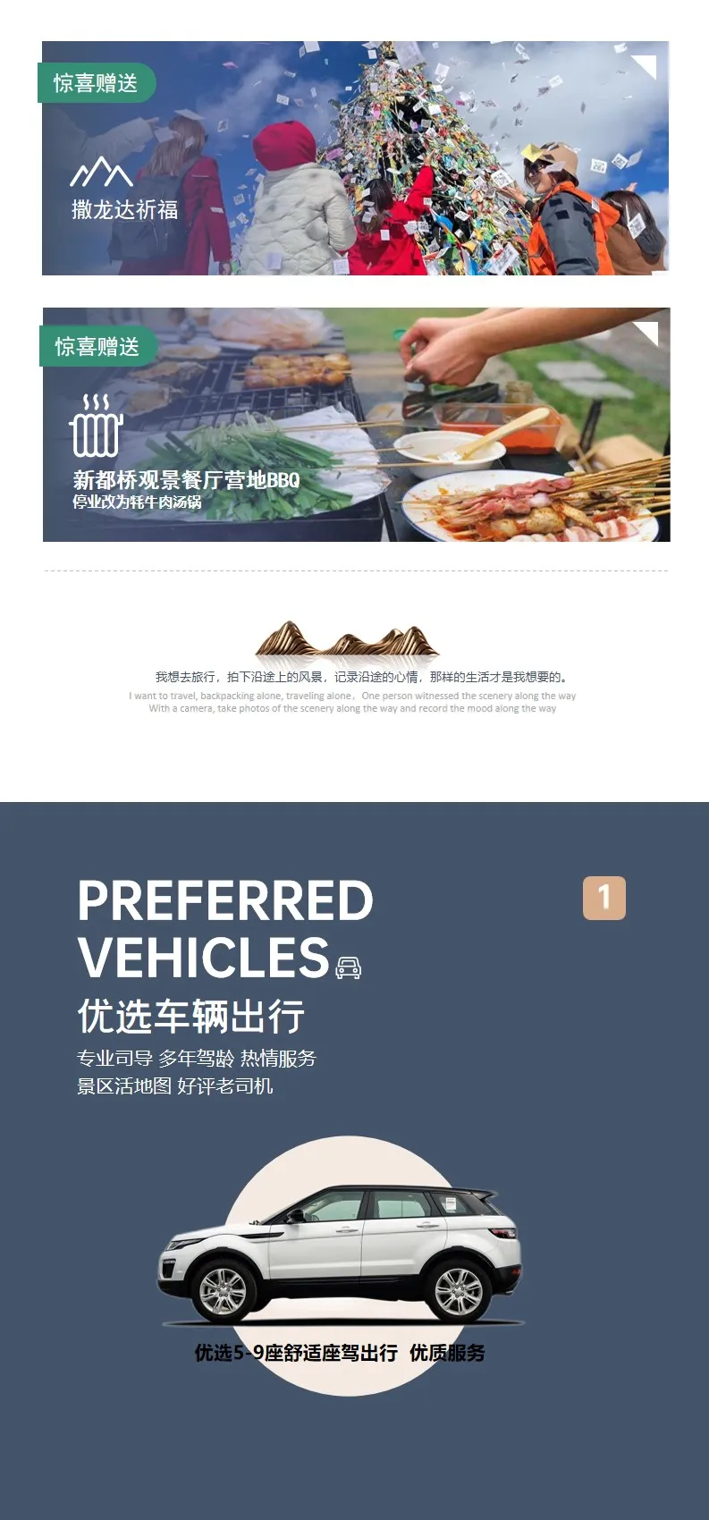 2、高海拔地区请勿跑跳,高原地区温差较大请带好厚外套,帽子围巾做好防晒,山上风大温度较低,预防感冒高反;如有不适可提前下山休息