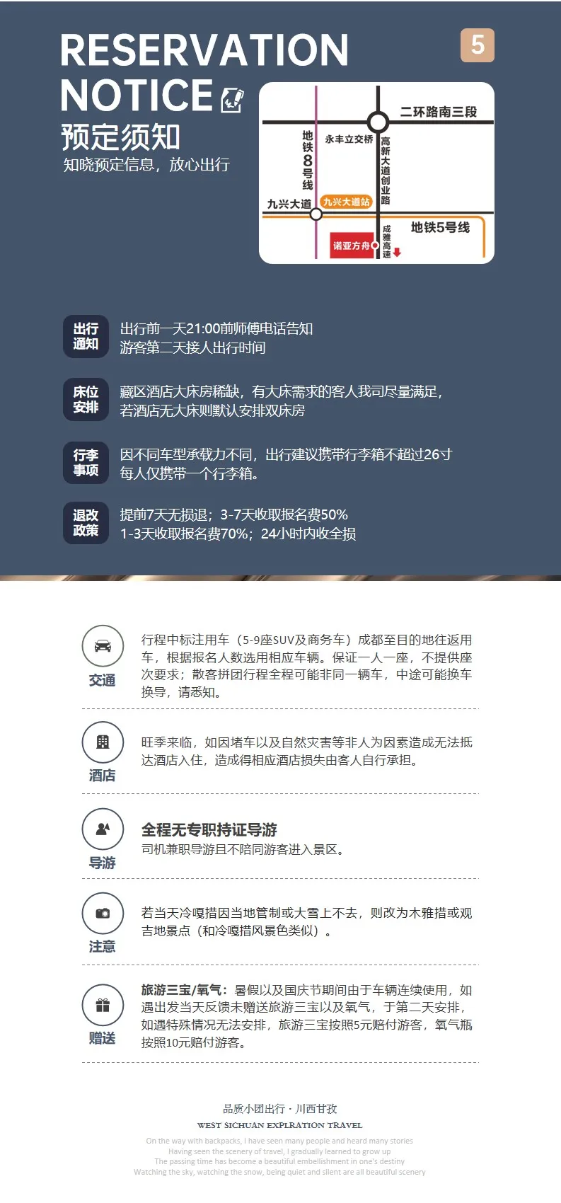 3、如遇节假日或交通管制等特殊情况,回到成都的时间较晚,建议回程安排次日航班和火车。