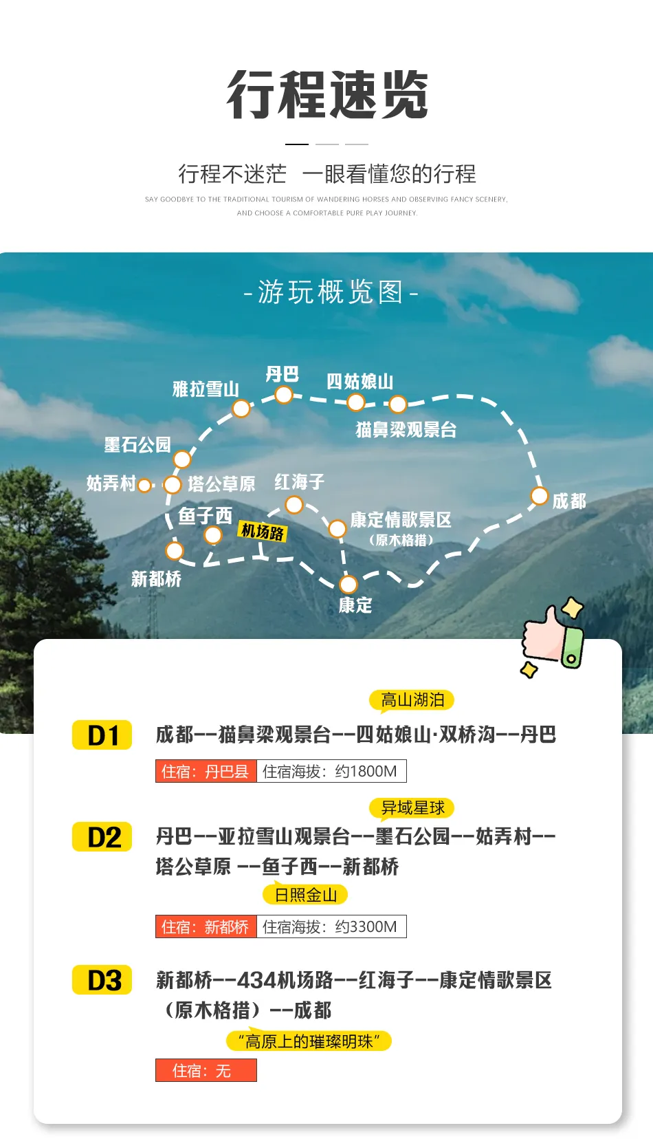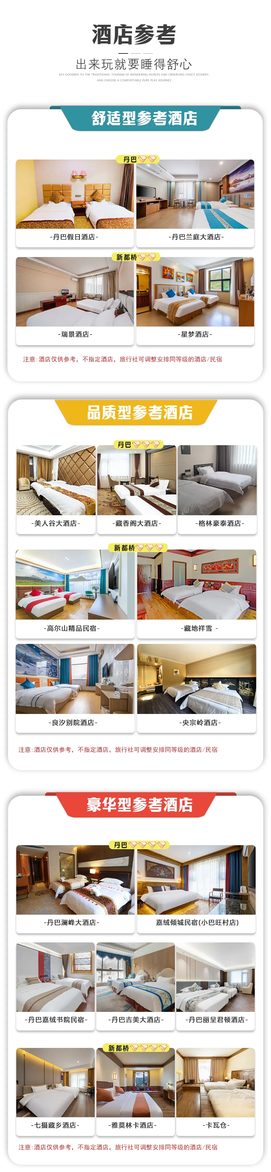 2、如鱼子西无法前往,替换为八郎生都村、扎真、新都桥观景台等同类型观景点,如产生相关景点中转车、清洁费等费用,需自理;