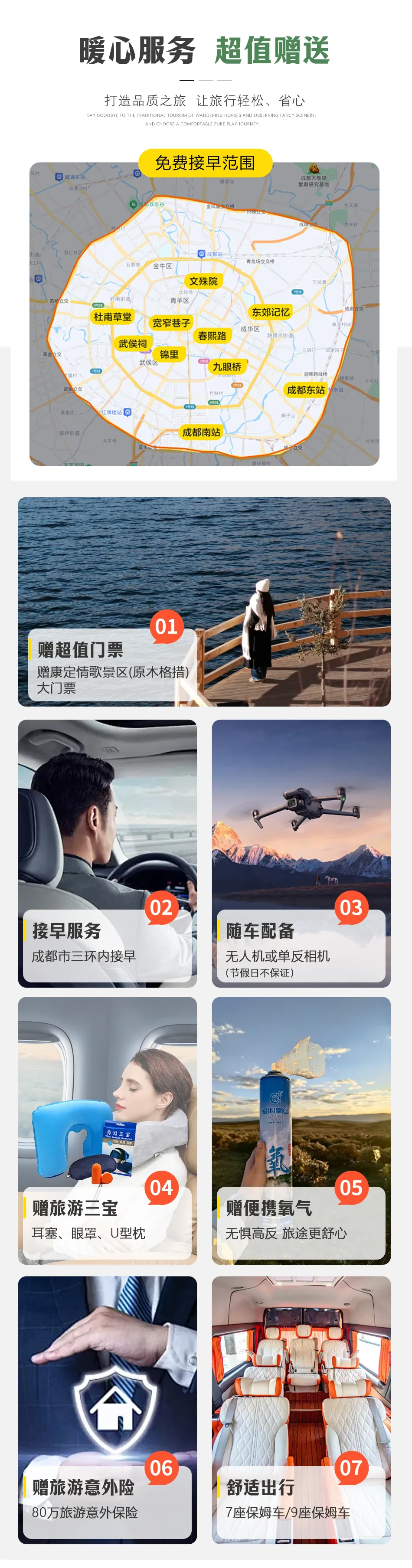 3、木格措景区门票为赠送项目,景区内观光车90元/人需自理,门票相关优免证件无退费,不进景区不退任何费用,请知悉。