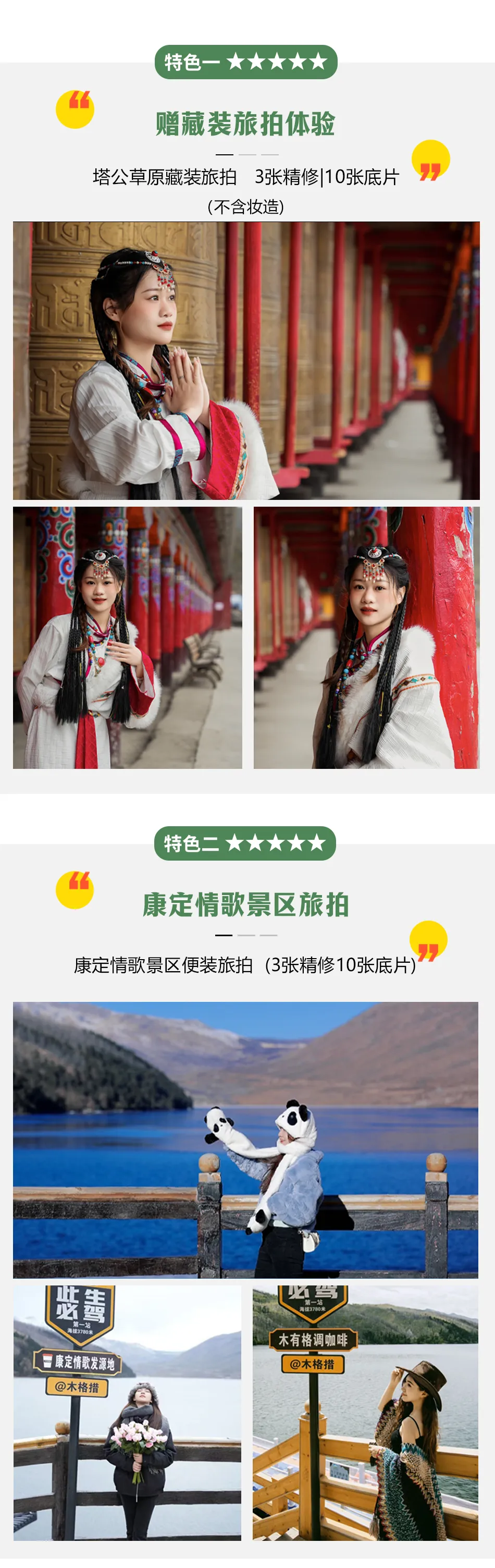 2、塔公定点简易藏装旅拍体验(含简单妆造:特色藏服1套+腮红+帽子/头饰+底片10张+精修3张--可升级底妆+彩绘(8选1)费用可咨询客服);